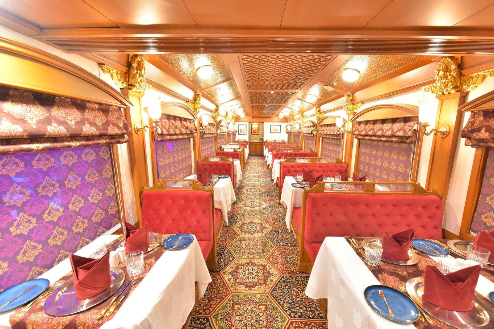 The Deccan Odyssey offers a luxury experience with interiors that remind you of royal Indian palaces. The train has 12 spacious coaches, designed to give you a comfortable and peaceful journey.